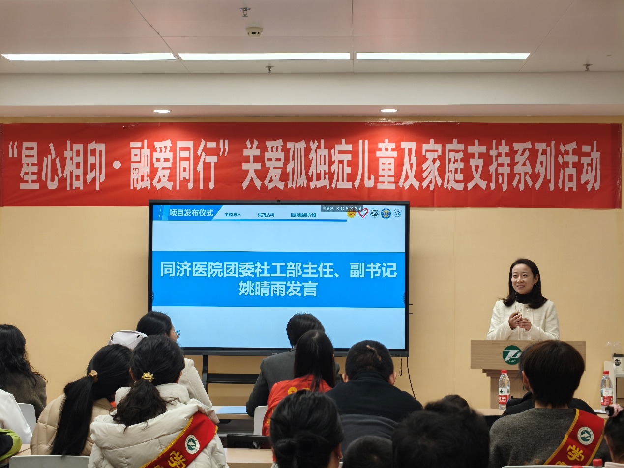 在项目启动仪式上,同济医院与服务队联合发布“星心相印”融合支持系列服务,并公布涵盖亲子手工、社交游戏、家长沙龙等活动安排。同济医院团委副书记、社工部主任姚晴雨首先致辞,她表示同济医院儿童保健科将持续为项目提供专业医疗支撑,为参与的孤独症儿童家庭提供科学、可靠的支持,并对与心心语志愿服务队的合作表达出强烈的信心和支持。