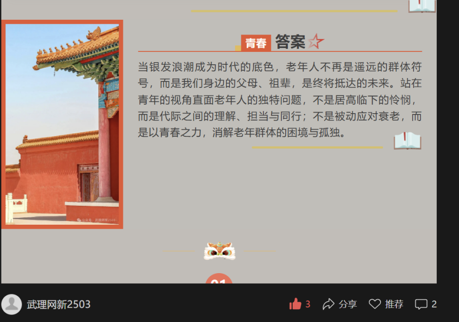 此次活动,既是网络与新媒体2503班团支部践行青年责任的具体体现,也是运用专业视角关注老年群体、传递温暖的实践探索。通过寒假走访调研,我们不仅真实掌握了家乡老人的生活近况,更深刻认识到,应对人口老龄化、解决老年人独居隐患,从来不是单一的技术赋能或单纯的人文关怀就能实现的。