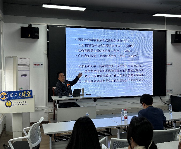 风笑天教授的讲座视野开阔,内容丰富,事例生动,与会师生均表示收益匪浅。据悉,本次讲座主题是风笑天教授主持的国家哲学社会科学研究文库的主要内容,成果曾获得广西自治区第十七届优秀成果一等奖(2022)与教育部第九届优秀成果三等奖(2023)。